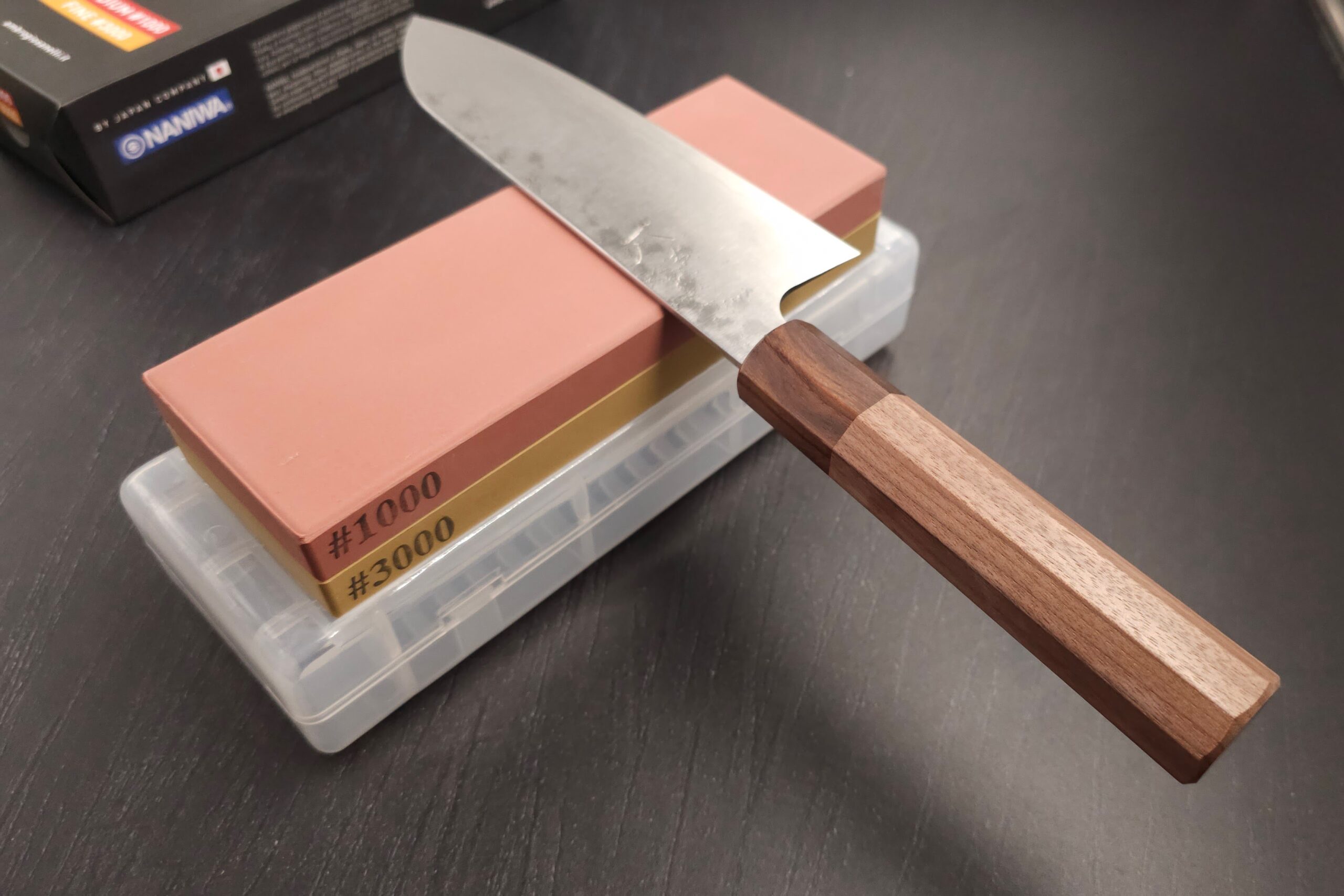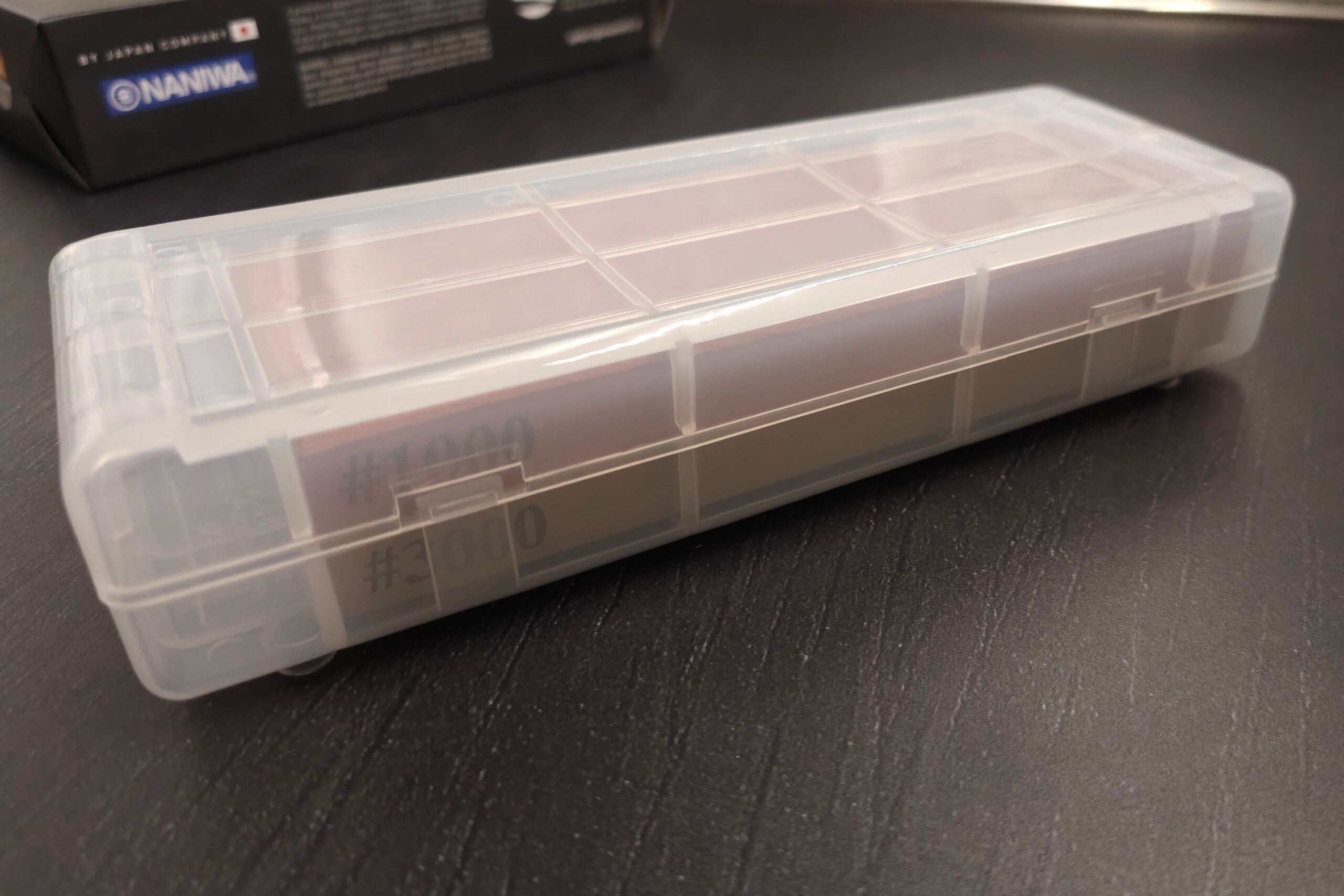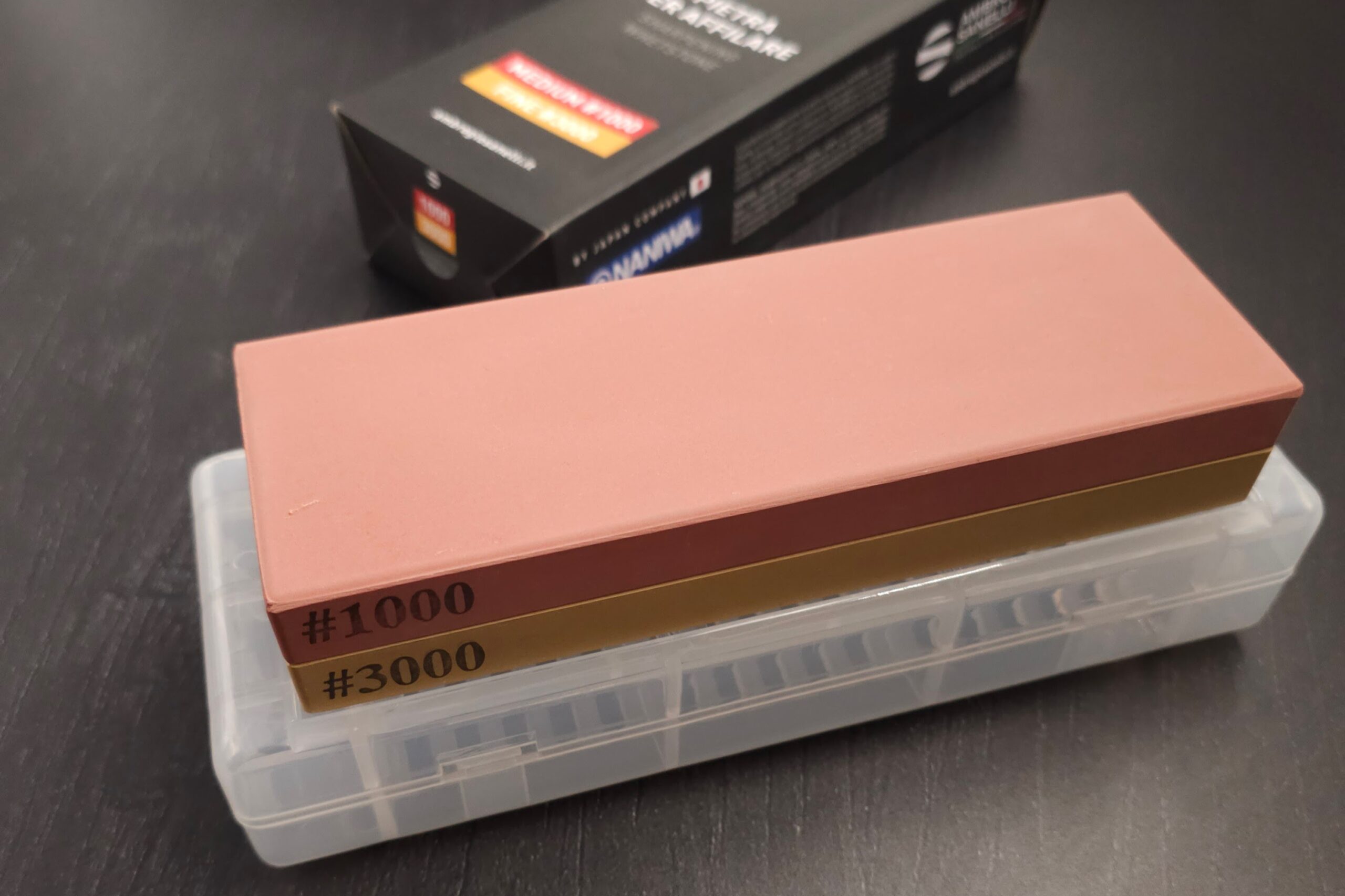 En sten som denne er hvad man kalder en kombi-sten altså en 2-sidet sten med hhv. korn 1000 som er mellem-grovhed og 3000 som er fin. Så start med side 1000 (den mørke) og slut på den lyse side bagefter.