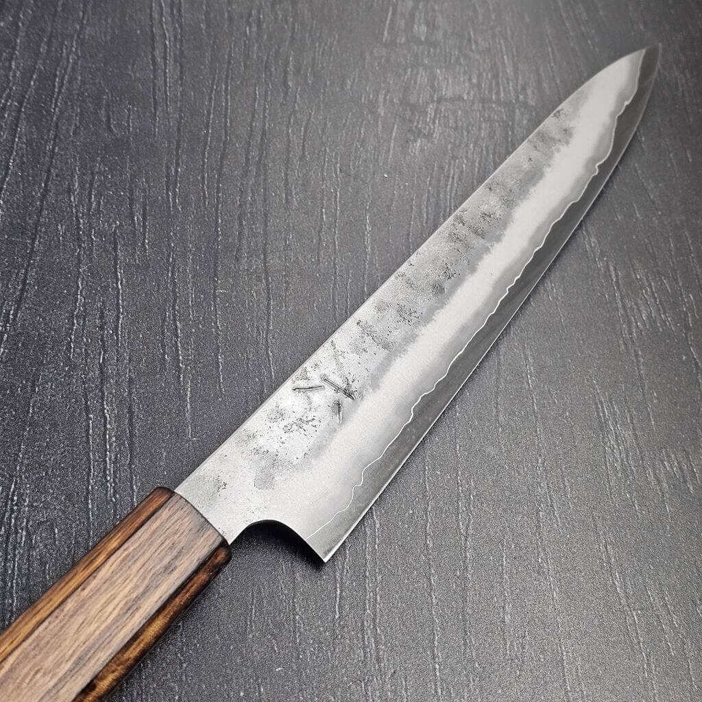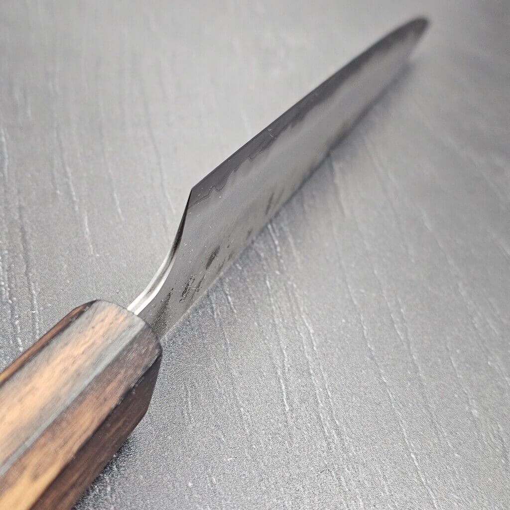 Normalt polerer og glasblæser jeg mine knive (kasumi eller bokashi-finish), men denne serie fortjente noget ekstraordinært. Derfor er klingen afsyret, hvilket giver den en dyb mørk finish og fremhæver lamineringslinjen mellem det bløde og hårde stål. Resultatet er en visuel perle, der virkelig skal opleves i virkeligheden!