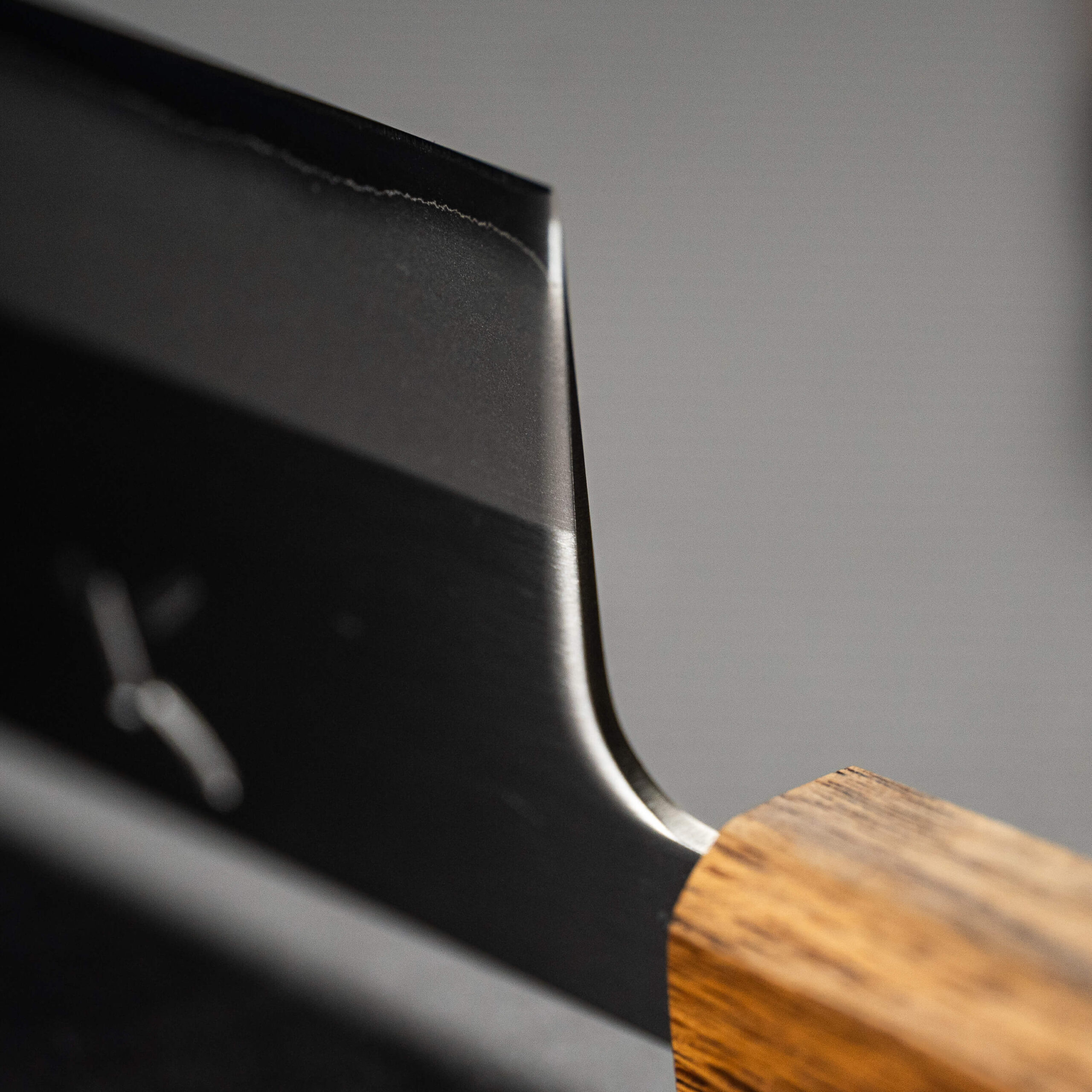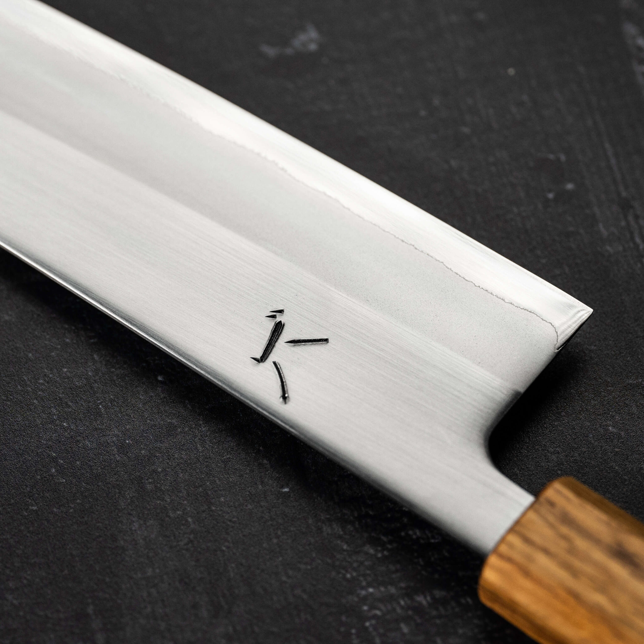 Kniven er lavet af traditionelt japansk hvidt-1 / Shirogami-1 stål, som er kendt for sin renhed og enkelhed, da det primært består af jern og kulstof ca. 1,3 %. Dette gør det muligt at opnå en skarp kniv, der bevarer sin skarphed i lang tid og udvikler en smuk patina over tid.