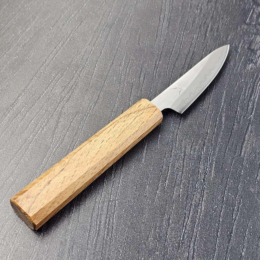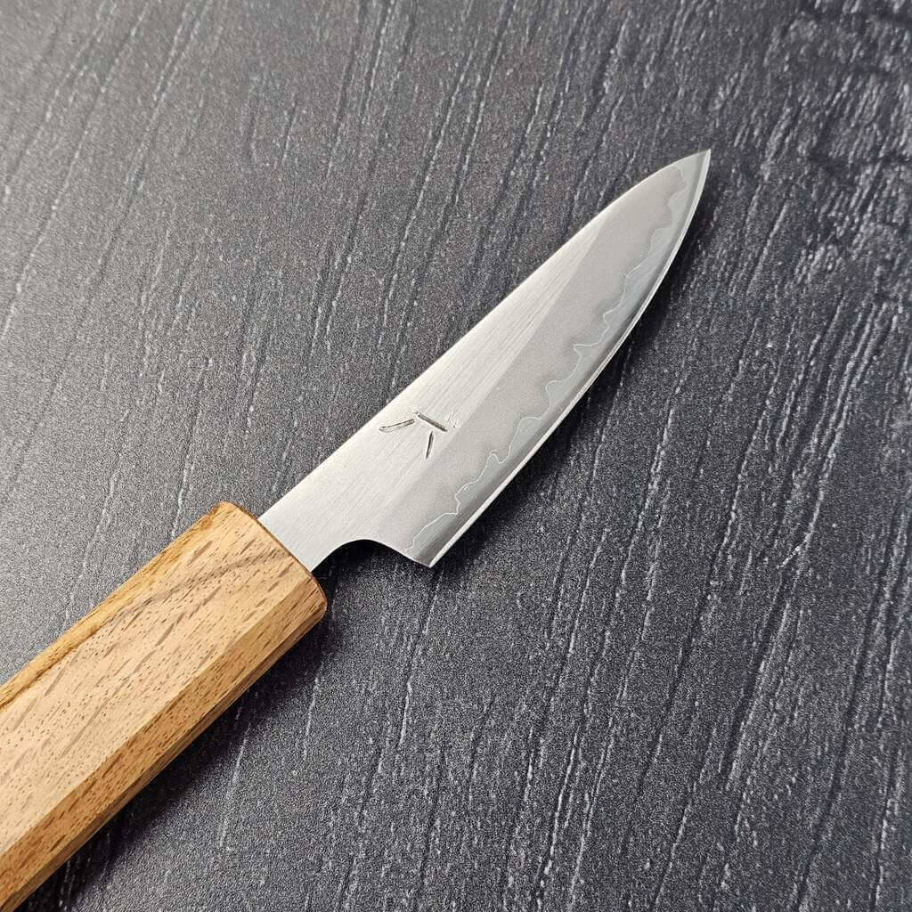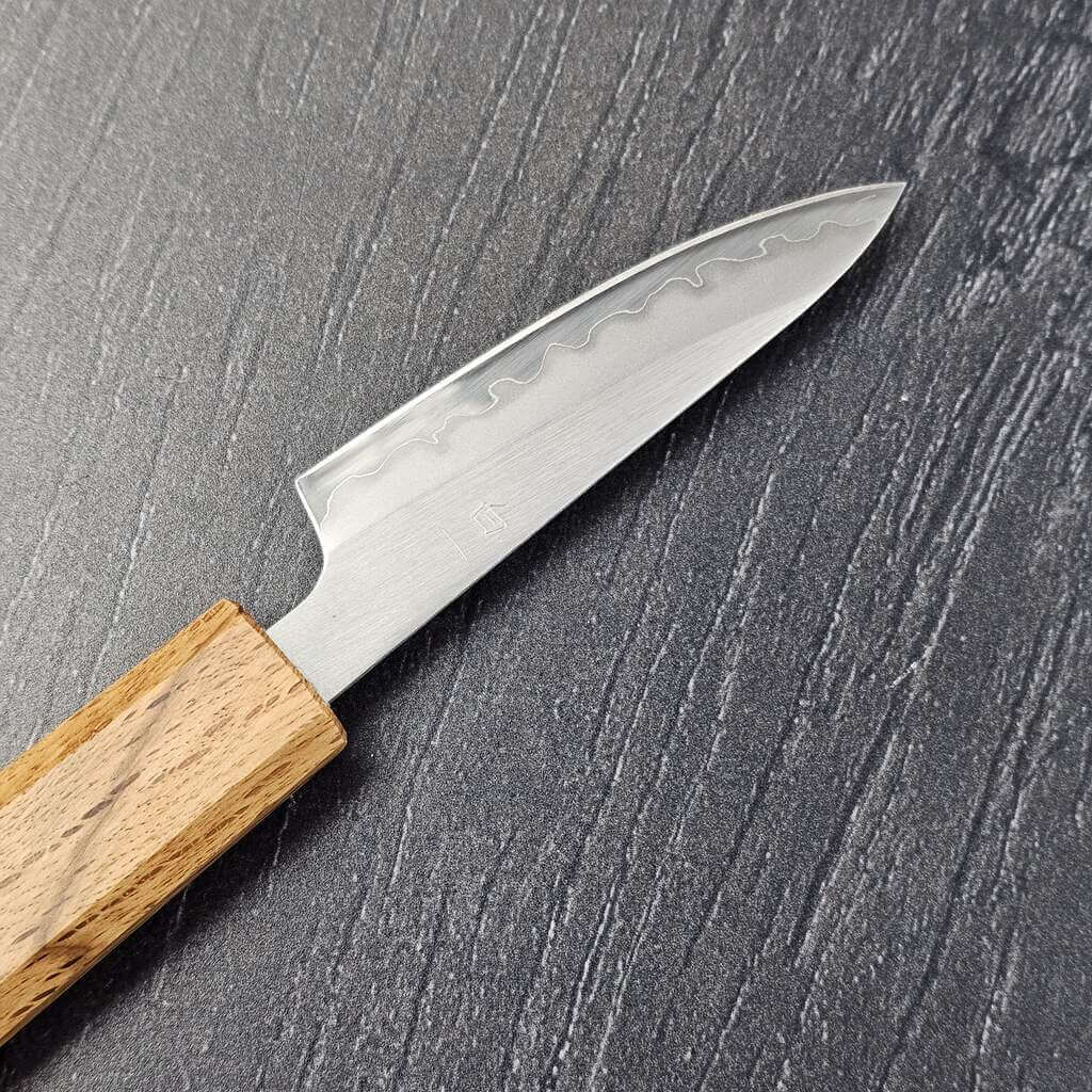 Det bliver ikke meget mere ægte når vi snakker japanske knive, end når de, som denne, er lavet i hvidt-1 stål. Det er af mange kokke og knivfolk opfattet som det reneste, mest ædle stål, da det dybest set blot indeholde karbon (ca. 1,3%) og jern. Pga. den meget fine struktur i stålet kan hvidt-1 stål blive helt fantastisk skarpt og er en stor fornøjelse at arbejde med.