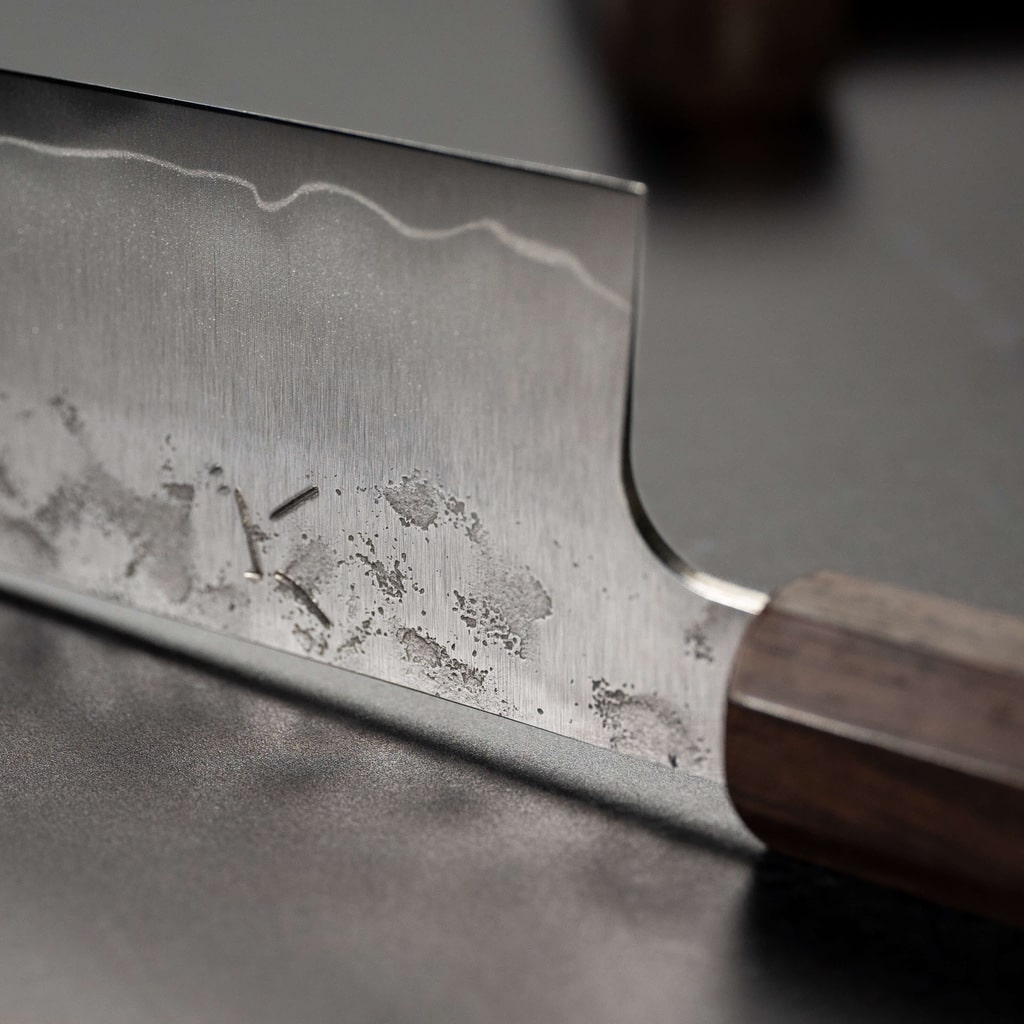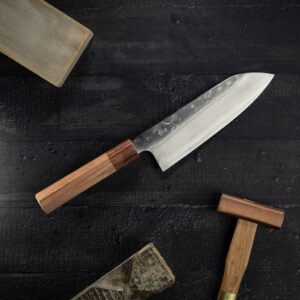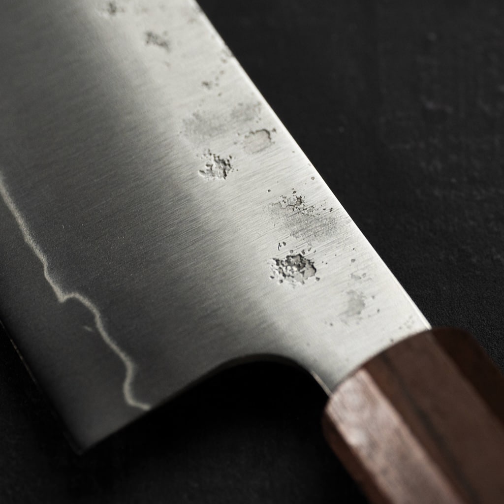 Efter lang tids forventningsfuld venten er vi glade for at præsentere vores sortiment af knive lavet lige her i Danmark. Den første serie, som vi kalder Takumi, er fremstillet af rustfrit Gin3-stål. Dette stål bevarer sin skarphed i lang tid takket være sin 1 % kulstof indhold, og det er tilstrækkelig hårdt til at klare forskellige opgaver i køkkenet. Med sine 14 % krom indhold er dette stål også kendt for sin høje korrosionsbestandighed – og det er netop det, vi ønsker at levere med denne serie: knive, der er skarpe og rustfri.