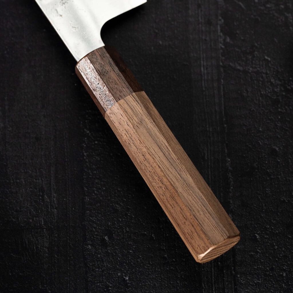 Skæfte form og materiale: Okt. Valnød og Rosewood– Ønsker du kniven med et andet skæfte, så kontakt os, så finder vi ud af det.