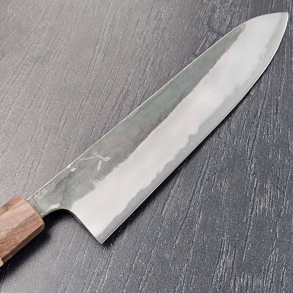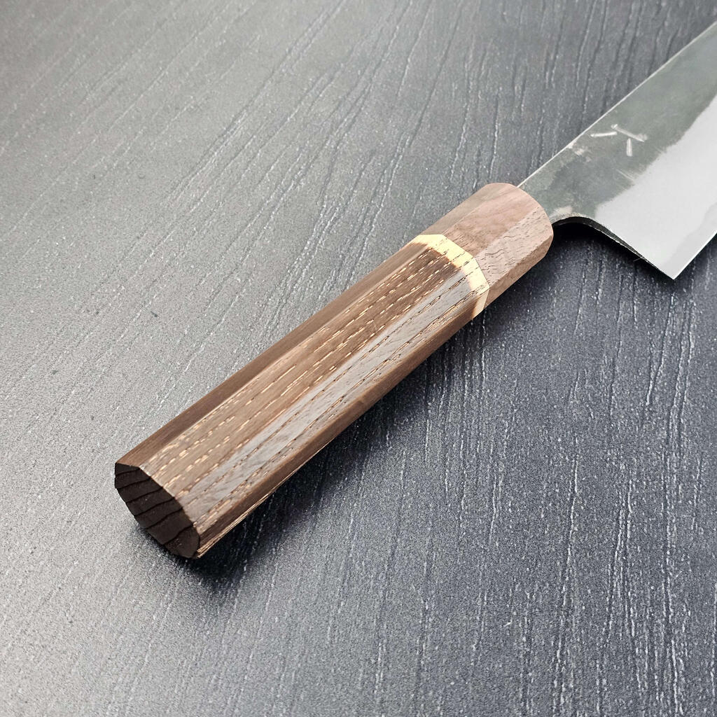 Jeg har valgt at vedligeholde den rustikke kurouchi-finish på knivens bagerste del og knivene fremstår generelt ret rå, og man kan næsten fornemme håndværket og det rå miljø de er lavet i.