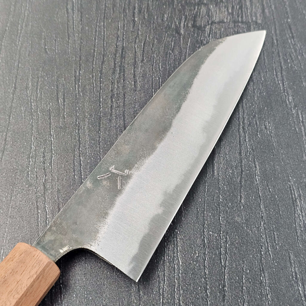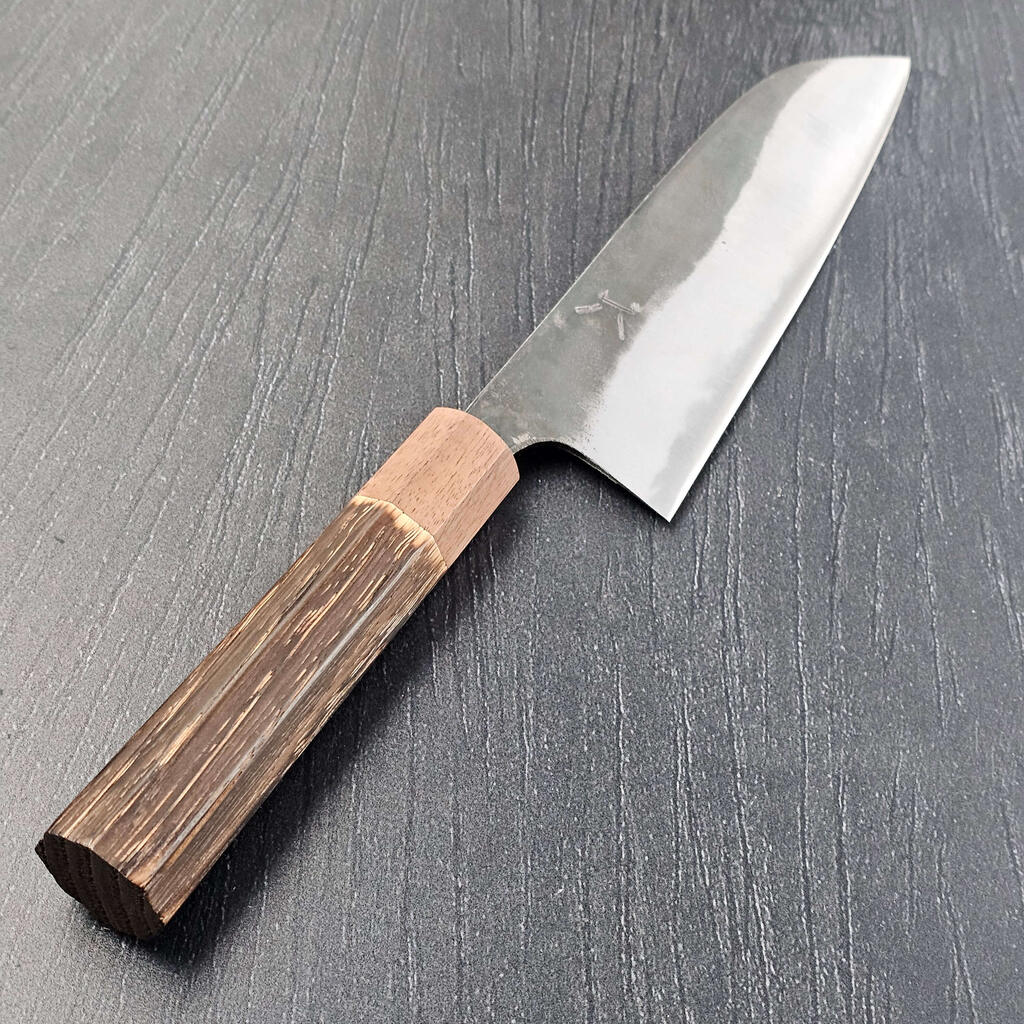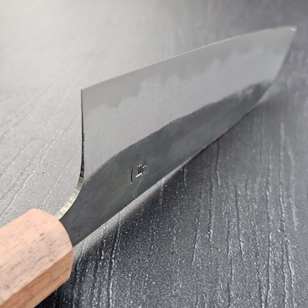 Jeg har valgt at vedligeholde den rustikke kurouchi-finish på knivens bagerste del og knivene fremstår generelt ret rå, og man kan næsten fornemme håndværket og det rå miljø de er lavet i.