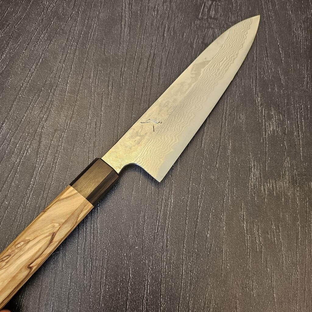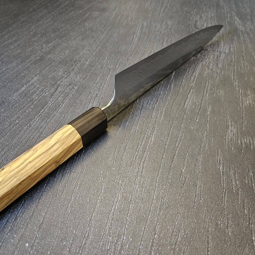 Skæftet på denne unikke kniv er oktagonalt og lavet i Oliventræ og Ibenholt. Utroligt smukt udført med godt med liv i træet som harmonerer fantastisk med damasken på bladet. Skæftet af lavet af de utroligt dygtige skæftemagere lige ledes i Sanjo, hvor kniven også er smedet.