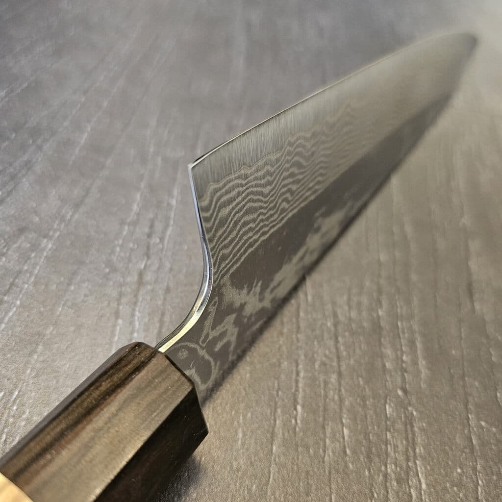 Jeg har lagt meget tid, koncentration og virkelig gjort mig umage for at tynde denne kniv ind, polere op, rundet ryggen, choil (stykker mod ved skæfte, mod din pegefinger) mm. (se billeder) Så du får et ægte unikum. En knivkyndig kunde har sammenliget skæreoplevelsen af den med de utroligt populære (og meget kostbare) Jiro-knive.